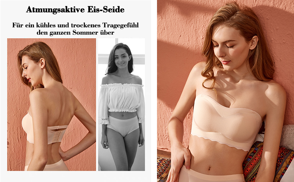 Im Gegensatz zu den meisten BHs auf dem Markt, die aus groben Materialien wie Nylon und Elasthan bestehen, ist dieser trägerlose BH aus Eisseide als Hauptmaterial gefertigt. Eisseide ist seidenweich und hautfreundlich. Die hohe Atmungsaktivität von Eisseide in Kombination mit den 1028 atmungsaktiven Mesh-Pads sorgt dafür, dass Ihre Haut jederzeit kühl und komfortabel bleibt. Um Ihre Haut rund um die Uhr trocken zu halten, besteht die Innenseite des BHs aus einer stark feuchtigkeitsableitenden Baumwollmischung. Für ein kühles und trockenes Tragegefühl den ganzen Sommer über.