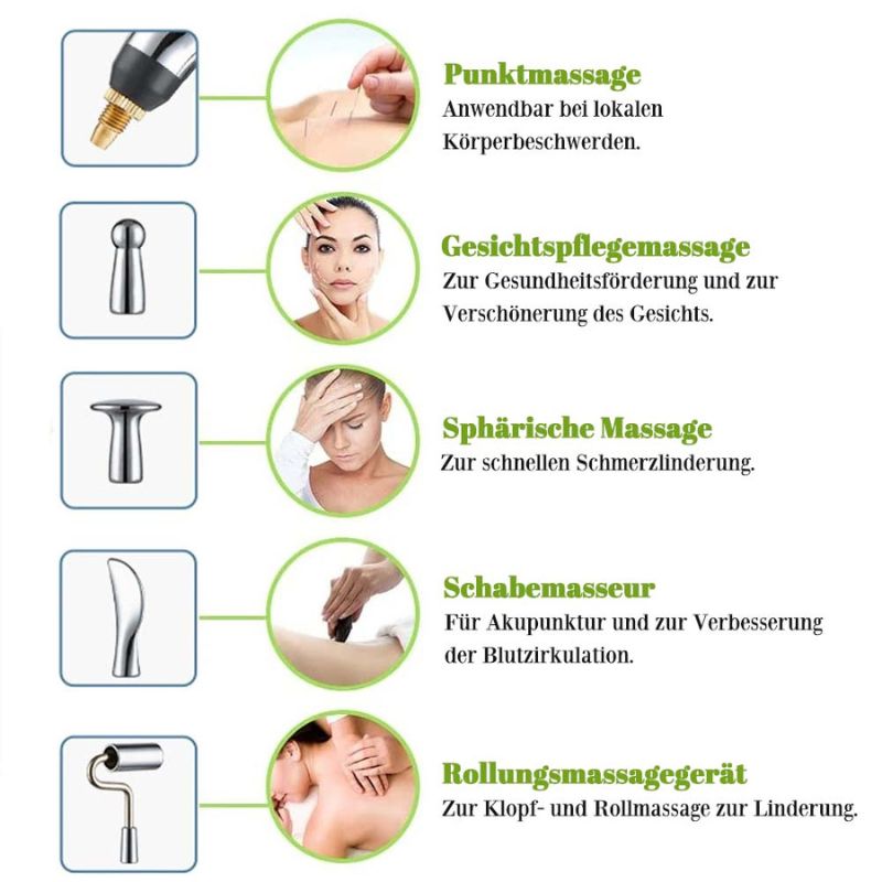 Set mit fünf Massageköpfen    1* Akupunkturstift + 5* Massageköpfe + 1* USB-Kabel + Anleitung